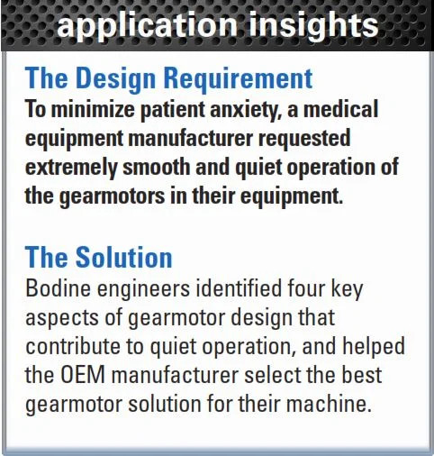On medical imaging systems, for example mammography machines, sometimes gearmotors are used to raise and lower a scanner to the level of a person being scanned. For these applications, smooth movement and ultra-quiet operation are the main design considerations. To achieve these objectives, Bodine's design engineers concentrated on four essential aspects of the gearmotor design.